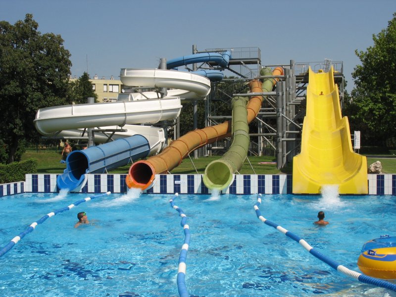 Szombathely, Węgry Basen kosztuje 1000 HUF (ok. 15 zł) ale można tu spokojnie przyjść i spędzić cały dzień. Oprócz kilku basenów o różnych kształtach, głębokościach i temperaturach mają tu zjeżdżalnie, masaże wodne, boiska do siatkówki, stoliki do szachów, restauracje i bary. Na szczęście nie skorzystali z polskich wzorców i bez problemu można tu kupić zimne piwo czy wino.