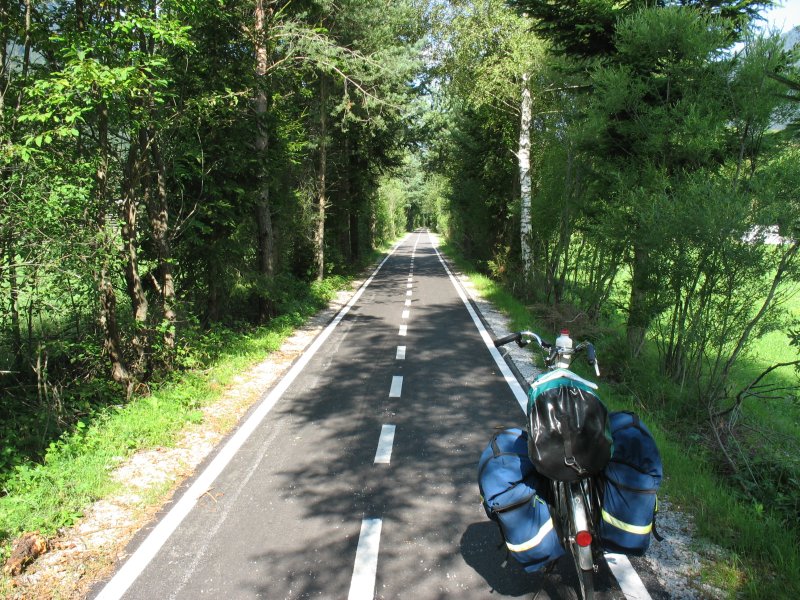Dovje, Słowenia A udałem się tam tą oto ścieżką rowerową. Ścieżka jest fantastyczna, super przygotowana, biegnąca przez las (cień !!!) ale co chwile odsłaniająca wspaniałe widoki na Alpy. Szkoda tylko, że w moją stronę pod górę - z naprzeciwka co chwilę mijały mnie całe rodziny beztrosko jadące sobie na luzie.