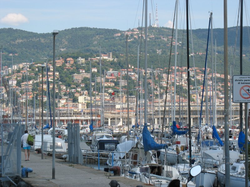 Triest, Włochy Nie przepadam za dużymi miastami. W Trieście pstryknąłem kilka fotek i udałem się w kierunku Słowenii. Dziwiło mnie tylko czemu co jakiś czas ktoś na mnie trąbi - wcześniej w tym regionie Europy jakoś nie zauważyłem żeby tak pozdrawiali rowerzystów. Zjechałem na zakupy do stacji benzynowej a kiedy miałem odjeżdżać zjawiła się policja i wyjaśniła mi o co chodzi - byłem na autostradzie. Właściwie to wyglądała ta droga na autostradę, ale udałem zdziwienie żeby trochę obniżyć mandat. Jednak oni nawet nie podjęli takiego tematu, zapytali dokąd chcę jechać i powiedzieli że będą mnie eskortować do odpowiedniego zjazdu. Jak powiedzieli tak zrobili i za kilka kilometrów byłem już na lokalnej drodze do Muggia.