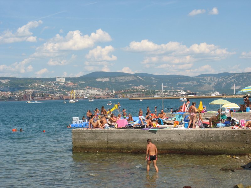 Muggia, widok na Triest, Włochy Początkowo chciałem nie objeżdzać cypla, tylko przejechać najkrótszą drogą do Słowenii. Szybko okazało się że nie jest to proste, drogowskazy ciągle kierowały na autostradę a na drogach które mogłyby biec w odpowiednim kierunku, stały znaki "ślepa ulica". Zatem pojechałem wzdłuż morza i dobrze - droga była bardzo łatwa i ładna.