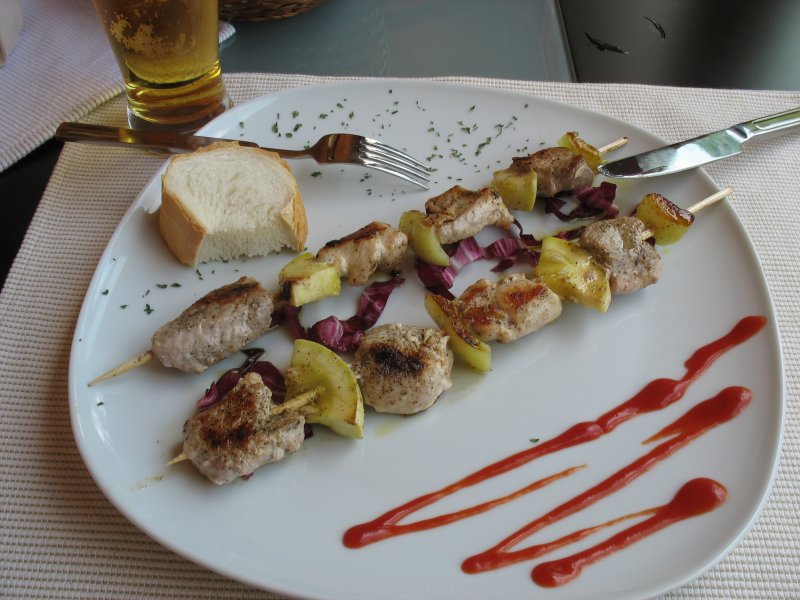 Gradinje, Chorwacja Według mapy w tej okolicy s± Ľródła termalne czy co¶ w tym stylu, liczyłem więc na kemping. Niestety znalazłem tylko jaki¶ kompleks wczasowy z basenem. Kilka km dalej trafiłem na knajpkę, wylosowałem danie i trafiłem na całkiem smaczny szaszłyk.