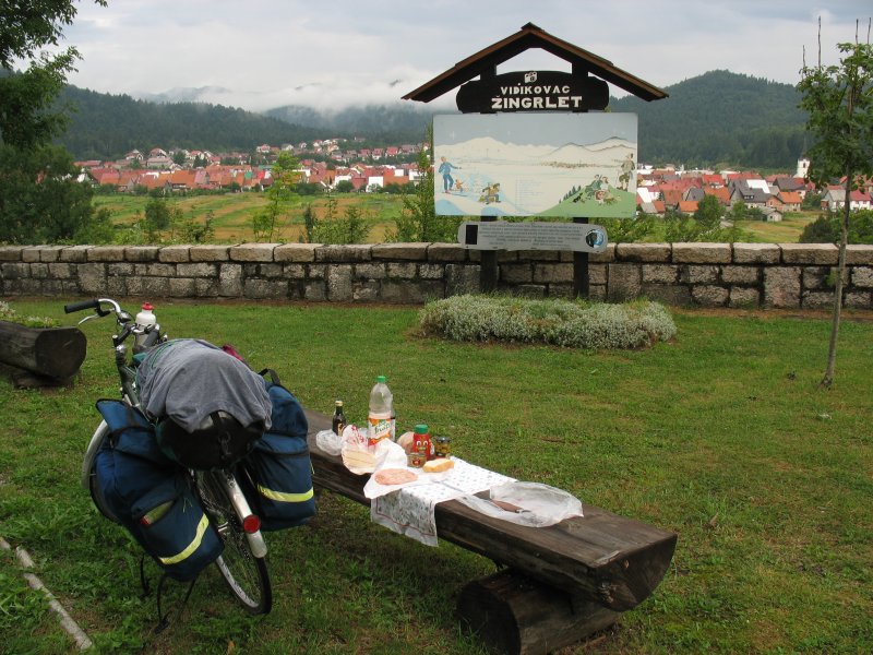 vidikovac Zingrlet, Delnice, Chorwacja Śniadanie w punkcie widokowym "Zingrlet". Z informacji tam umieszczonej dowiedziałem się że miasto w którym nocowałem (Delnice) jest najwyżej położonym miastem w Chorwacji (ponad 900 m n.p.m).