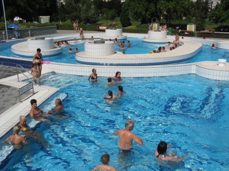 Szombathely, Węgry W Szombathely wypatrzyłem na GPS-ie stadion i jakieś niebieskie prostokąty - zgadza się - trafiłem na kompleks basenów. Obok był Topart Camping, zostawiłem bety w domku i popołudnie spędziłem na basenie.