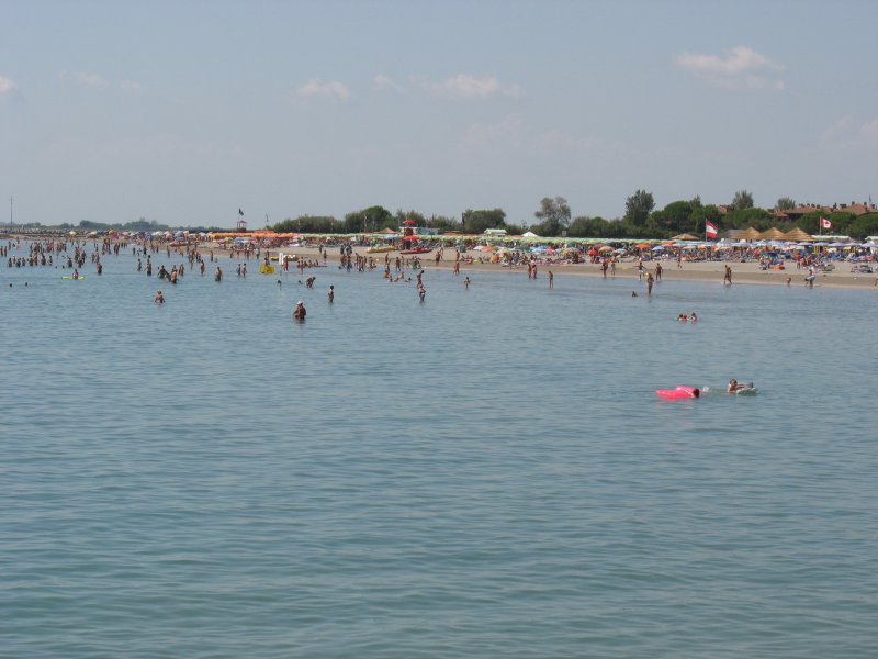 Grado, Włochy Szybko dojechałem do Grado, gdzie upał skierował mnie w stronę plaży miejskiej. Wygląda dość ładnie, wejście do wody jest kamieniste, niestety nabrzeże całe asfaltowe i brak jakiegokolwiek cienia. Zrobiłem zdjęcie plaży po drugiej stronie zatoczki, ale nie planowałem jazdy w tamtym kierunku, więc zrobiłem zwrot na wschód i rozpocząłem poszukiwania kempingu.