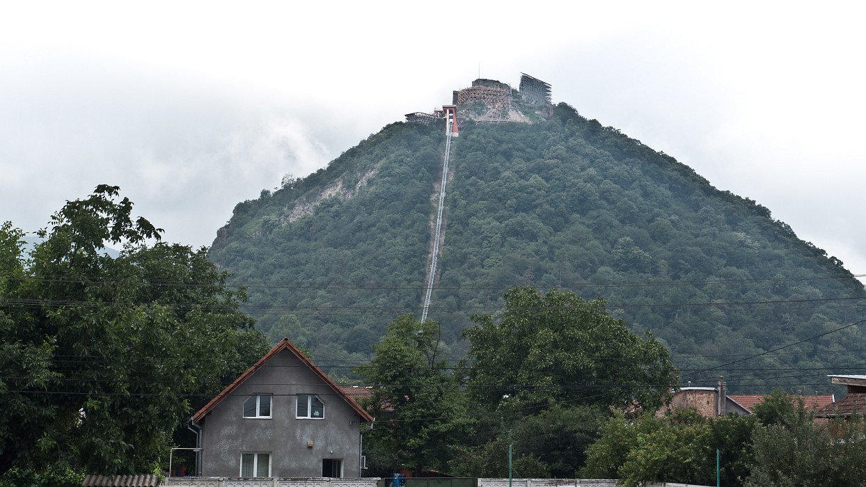Deva, Rumunia W Deva mijałem jak±¶ budowlę umieszczon± na naprawdę wysokim wzgórzu. Prowadzi do niej kolejka któr± można wjechać na góre i podziwiać panoramę miasta. Niestety z t± kolejk± zapoznałem się tylko z szyldów reklamowych gdyż aktualnie była w remoncie.