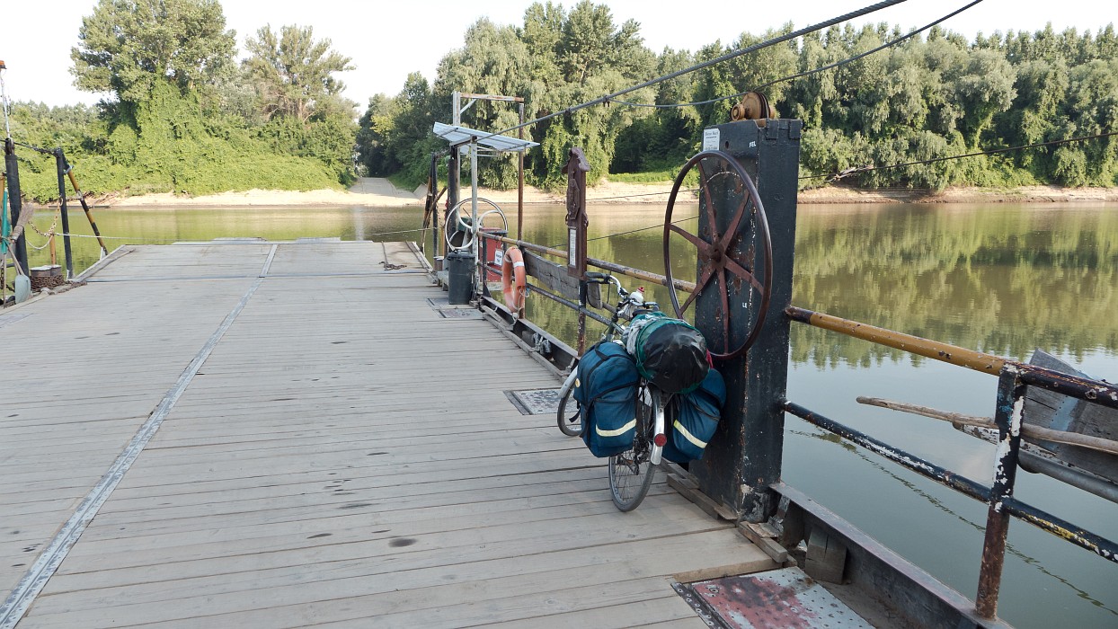 prom przez Cisę, Mindszent, Węgry Ten na przykład nie potrzebuje silnika. Metalowym kołem sternik ustawia odpowiedni k±t promu względem nurtu rzeki, a ten powoli i bezszelestnie przepycha prom na drug± stronę.