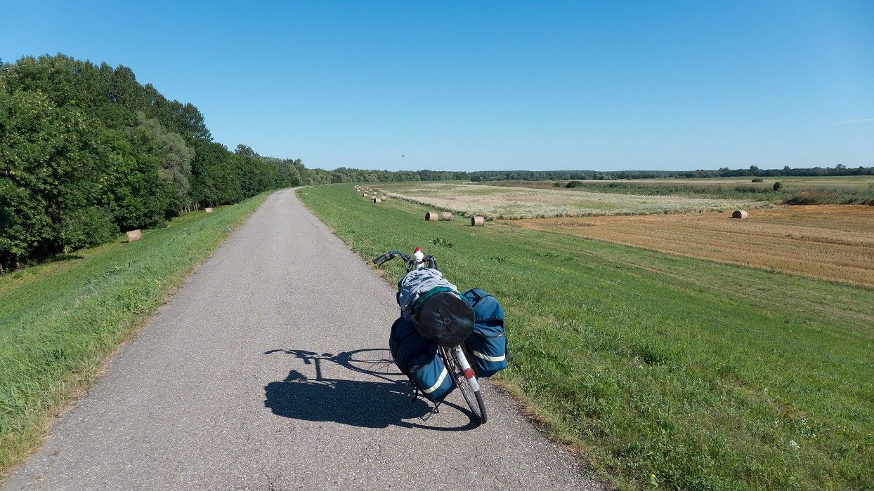 droga wzdłuż Cisy na północ od Tiszafured, Węgry Krajobraz zmienia się tylko nieznacznie. Jadąc zatrzymywałem się co jakieś pół godziny i robiłem fotkę. Nie ma sensu ich tu jednak prezentować, gdyż różnią się niewiele. Przez 70 km jedzie się drogą, która wygląda jak na tym zdjęciu.