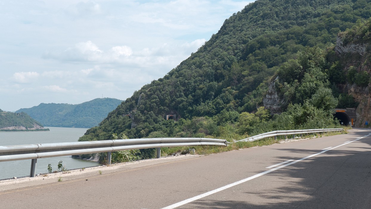 Lepenski Vir, Dunaj, Serbia Zaczynają się tunele - na odcinku kilkudziesięciu kilometrów jest ich 21. Nie są zbyt długie, od 100 do 500 metrów. Na tym zdjęciu już widać 3 z nich. Ich cechą wspólną jest brak oświetlenia i zakręty.