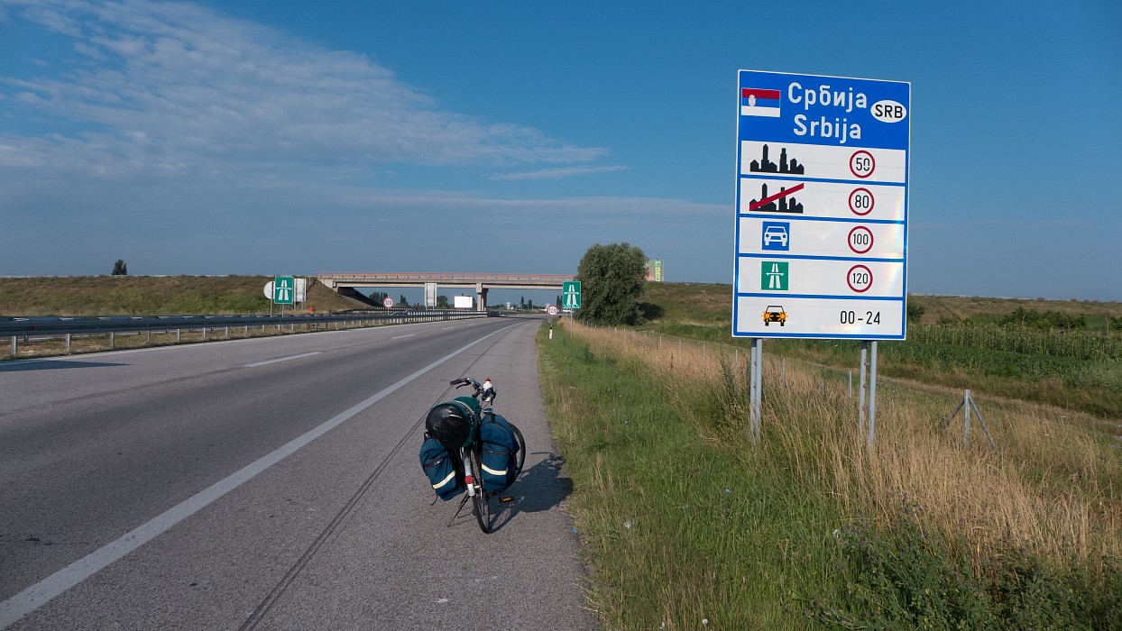 przejście graniczne Horgos, Serbia Przejście graniczne znajduje się na autostradzie. Nie ma jednak problemu z przejechaniem go rowerem - od strony węgierskiej na drogę z przejściem wyjeżdża się już za znakami końca autostrady. Celnicy też się nie dziwili więc zakładam że jechać można. Jednak po stronie serbskiej za kilkaset metrów stoją znaki autostrady. Wolałem nie ryzykować i przez dziurę w siatce przedostałem się z dobytkiem na polną drogę.