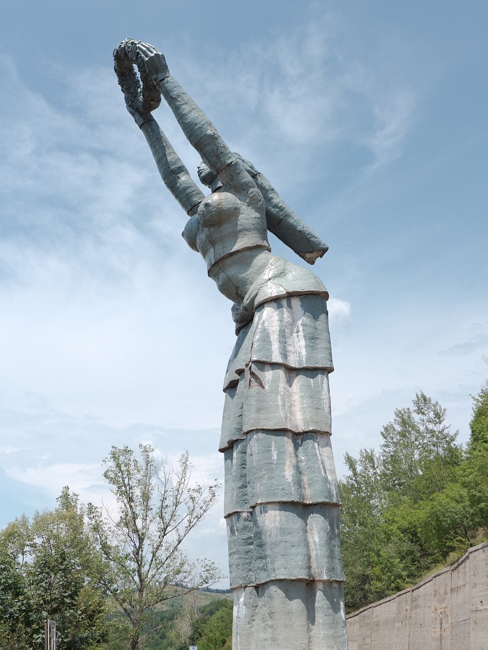 Orsova, Rumunia Po przejechaniu przez znajdującą się na Dunaju elektrownię znalazłem się w Rumunii. Tu na wjeździe do Orszowy podróżnych wita bliżej nieokreślona dziewoja proponując założenie wieńca.