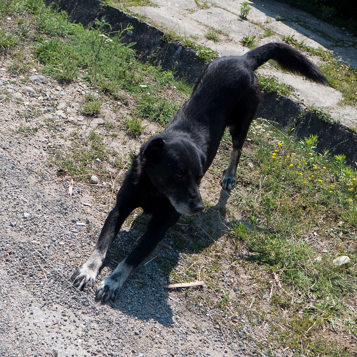 Novaci, Rumunia Nadszedł czas aby napisać o rumuńskich psach. Bezdomnych psów są tu bowiem setki czy tysiące. Mijałem wsie gdzie przed każdym domem włóczyły się 2 czy 3 psy. Są wszystkich ras i maści od małych po ogromne. Wszystkie mają za to 1 wspólną cechę - są zupełnie spokojne. Leniwie przemieszczają się lub leżą w cieniu szukając wytchnienia. Raczej unikają podchodzenia do ludzi, czasem jeśli się je zawoła potrafią powoli podejść. Żaden nigdy nie wzgardził kromką suchego chleba czy starą bułką.